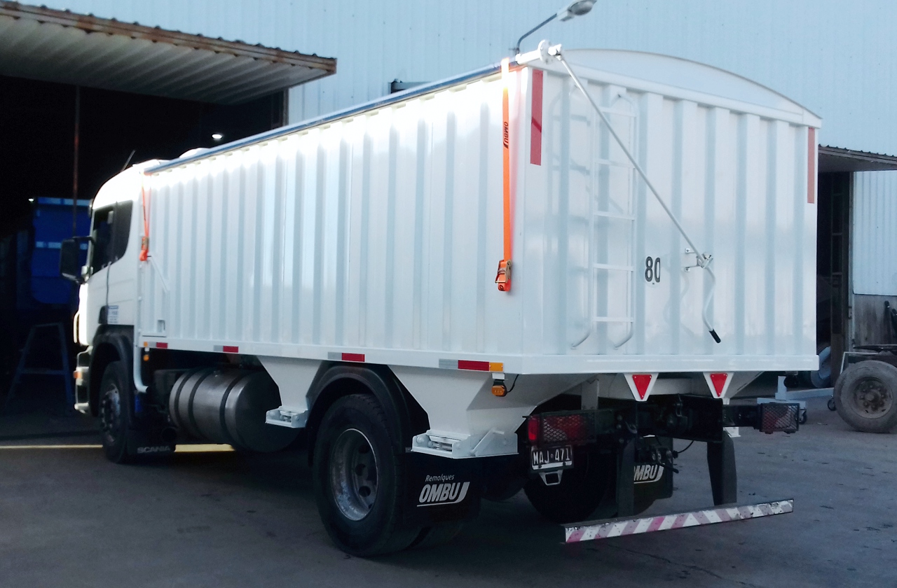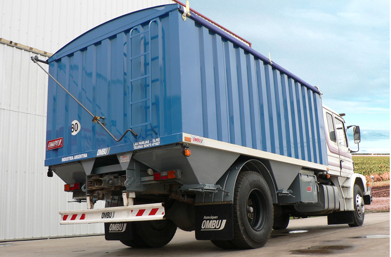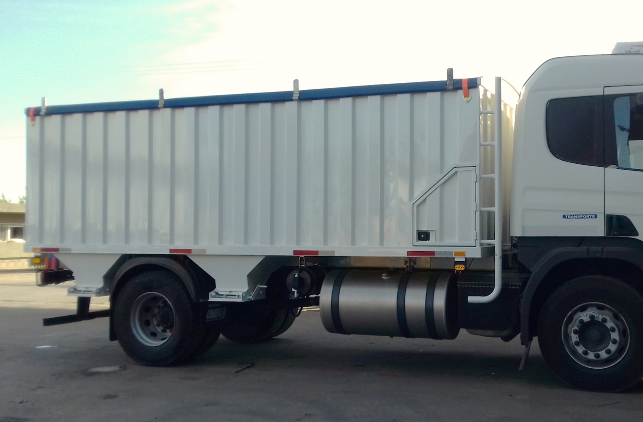 Capacidad: 16 a 18m3. Largo: 5 a 5.50m. Carrozado fabricado en chapa N° 14 (2mm) con estampado de nervaduras verticales. Boquillas de descarga de apertura manual tipo guillotina. Cobertura de lona mecanizada de accionamiento manual. Opcional: cuchetín porta objetos. Instalación de luces reglamentarias completas.