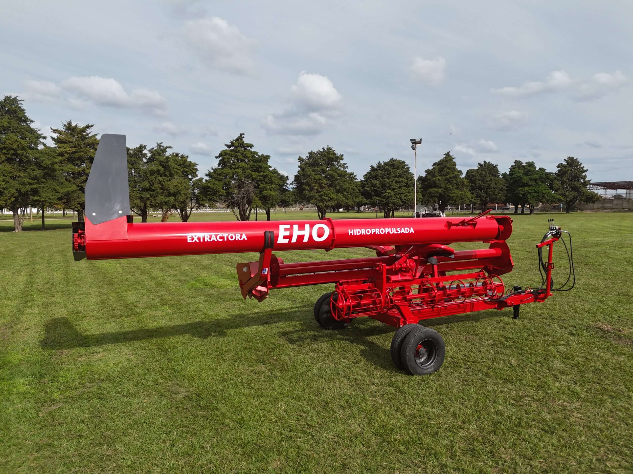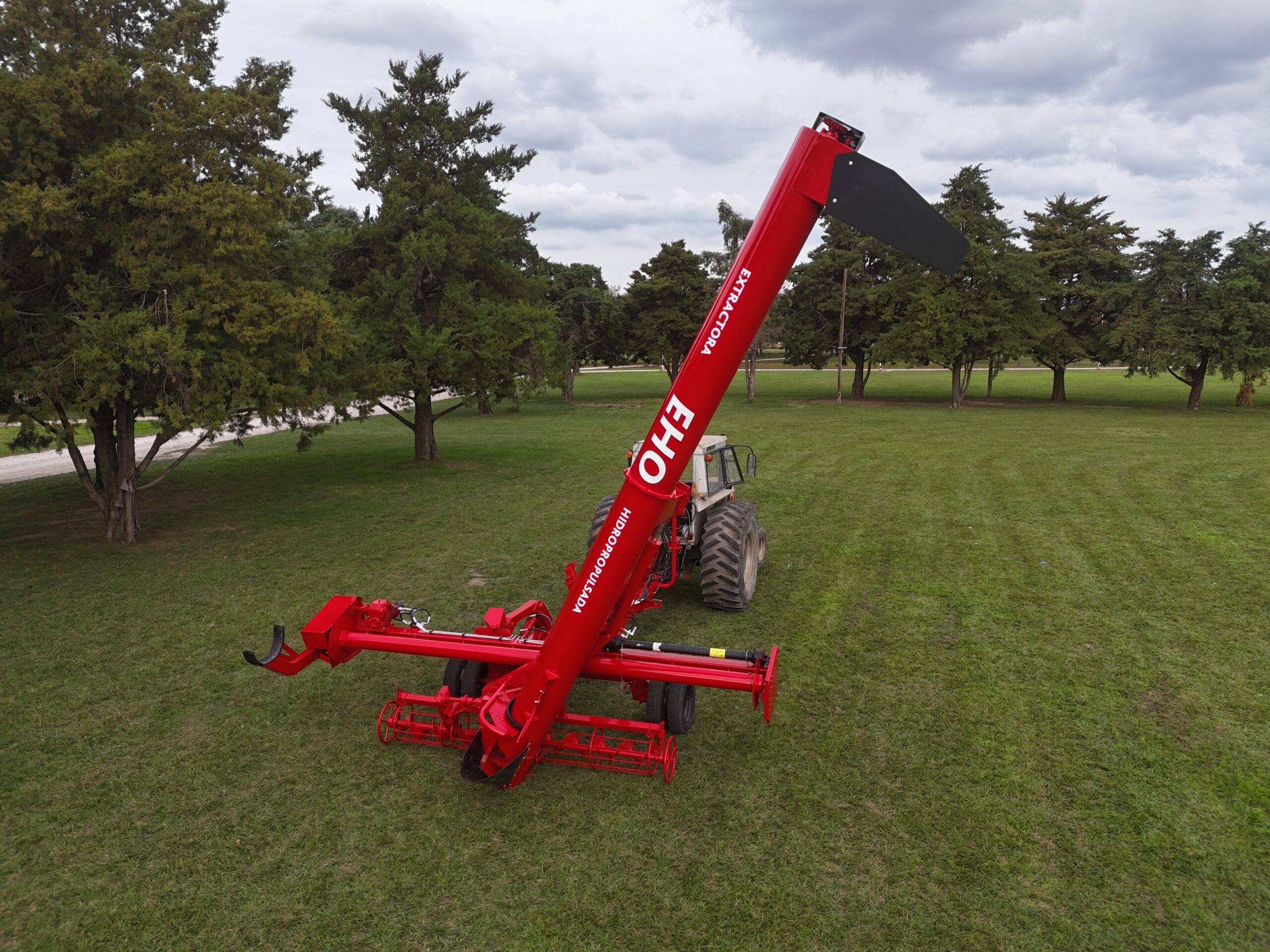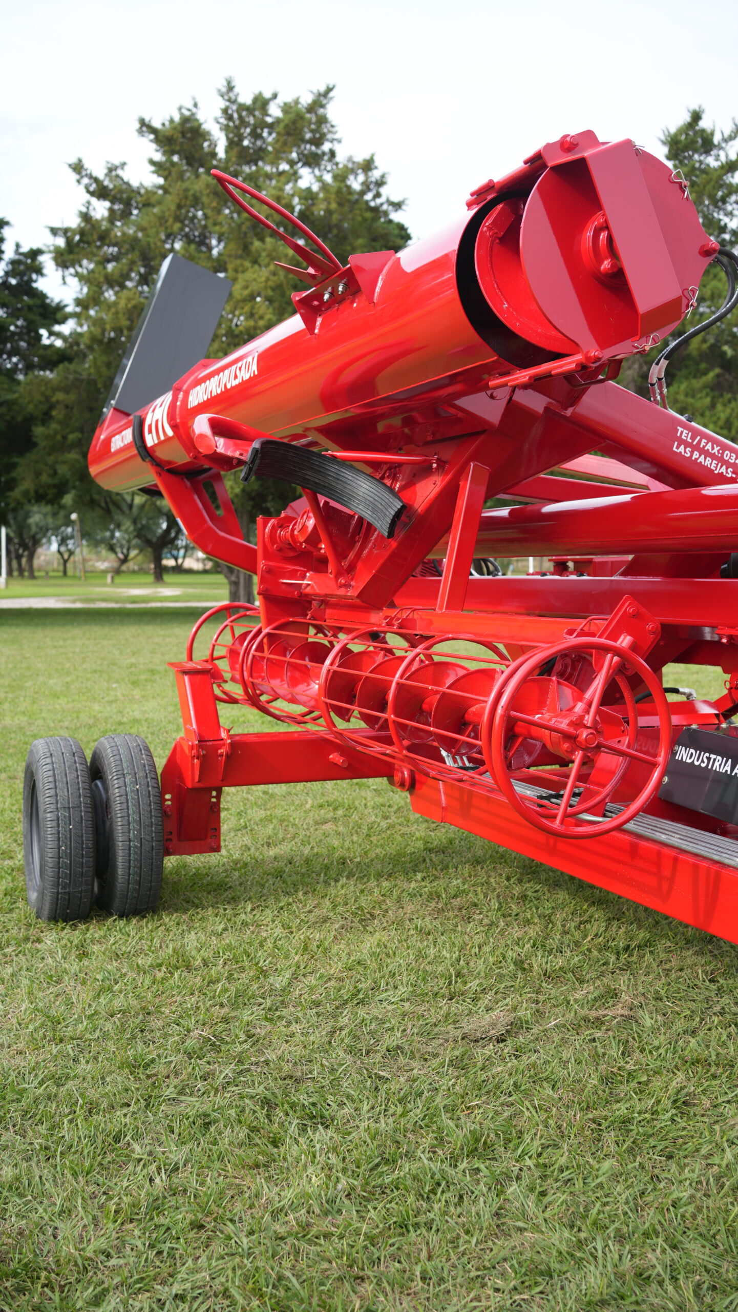 Cuenta con un sistema de doble rolo que lamina la bolsa, a medida que va extrayendo va siendo laminada por los rolos y va quedando extendida por debajo de la máquina y el tractor. Ésta máquina tracciona al tractor con el sistema de rolos y va sacando el grano a medida que va avanzando. Es un equipo que posee una capacidad de 220 Ton/ Hora de trabajo continuo. Tubo descarga de Ø 400mm con sinfín enterizo sin bancada central lo que reduce el porcentaje de daño mecánico. El sistema de pasaje de bolsa cuenta con una ventaja por sobre los sistemas de enrollado: En cualquier momento de la extracción puede cortarse la bolsa y retirar la máquina sin necesidad de tener que desenrollar los metros ya extraídos. Ésta es una ventaja notable ya que se produce un ahorro en los tiempos productivos que el campo exige. Su sistema auto-trailer redice los tiempos de cambio posición (transporte/trabajo y trabajo/transporte). Cuenta con cilindro hidráulico para la regulación de altura de trabajo y despeje en transporte. La operación es sencilla ya que cuenta con un regulador hidráulico para comandar la velocidad de trabajo.