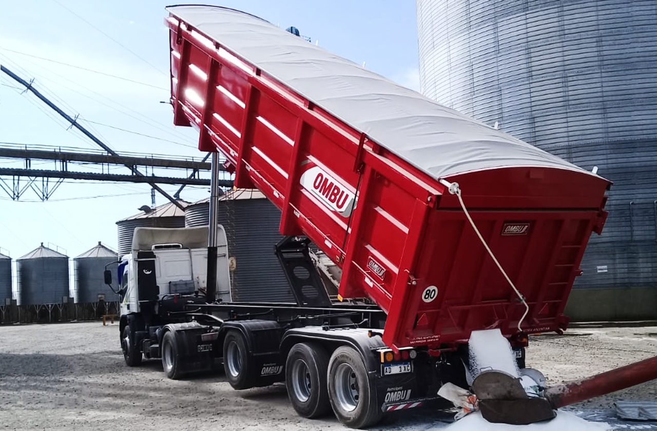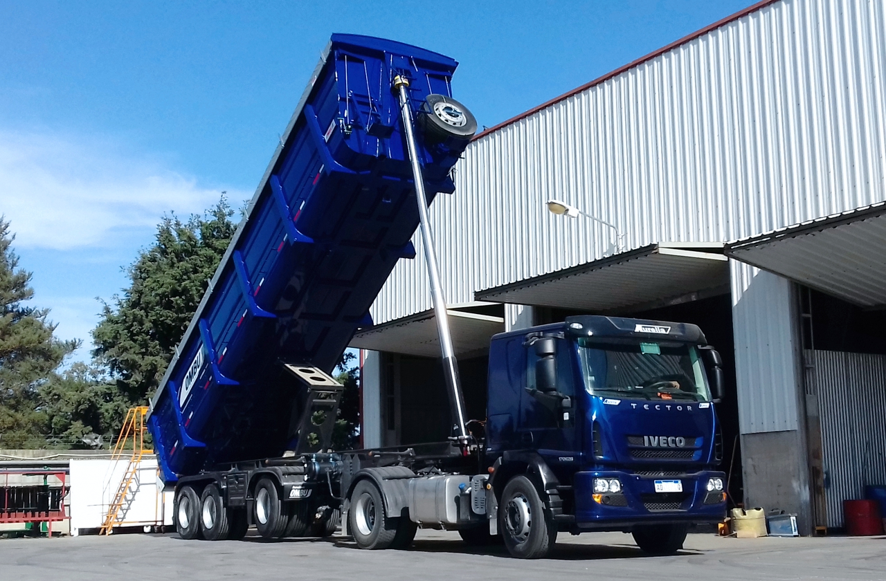 Capacidad: 40m3. Tara en orden de marcha: 9000 Kg. Chasis: Recto construido en acero micro-aleado MLC 420. Manotas de acero estampado. Guardabarros plásticos. Caja: En acero micro-aleado MLC 420. Ángulo de vuelco: 45°. Cilindro hidráulico de 8" x 5 etapas 5600mm de carrera. Válvula de fin de carrera y limitadora de presión. Puerta trasera de triple apertura. Basculante y lateral con boquilla reguladora. Tijera estabilizadora que garantiza rigidez lateral cuando la caja opera en altura. Rodado: llantas disco 9.00 x 22.5 sin cámara. Frenos: de 8" Meritor sistemas Q MAX. Levas con bujes lubricados. SPRING BRAKE en donde lo requiere. Ejes: Ejes tubulares de acero micro-aleado. Combinación 2+1. Dos ejes a ballesta más uno auto-direccional con suspensión neumática y levanta-ejes. Lubricación a grasa. Frenos 8". Largo de eje: 71". Cobertura de lona estándar de fábrica. Opcional: sobre-baranda que aumenta la capacidad de la caja a 44m3. Depósito de aceite con 180 L. Conjunto de toma de fuerza y bomba para acoplar al camión. Pintura poliuretanica de 90 micrones de espesor. Sistema lumínico de led y lámparas. El equipamiento cumple con la Ley de tránsito y Seguridad Vial N° 24.449.