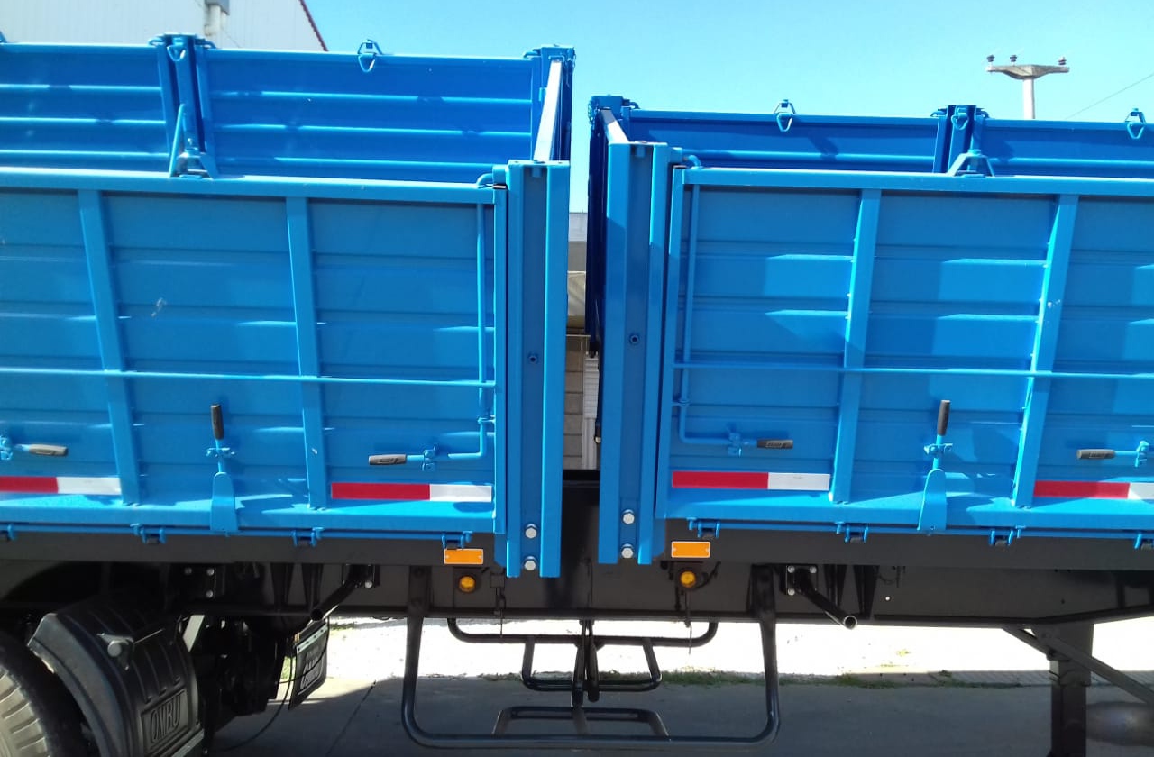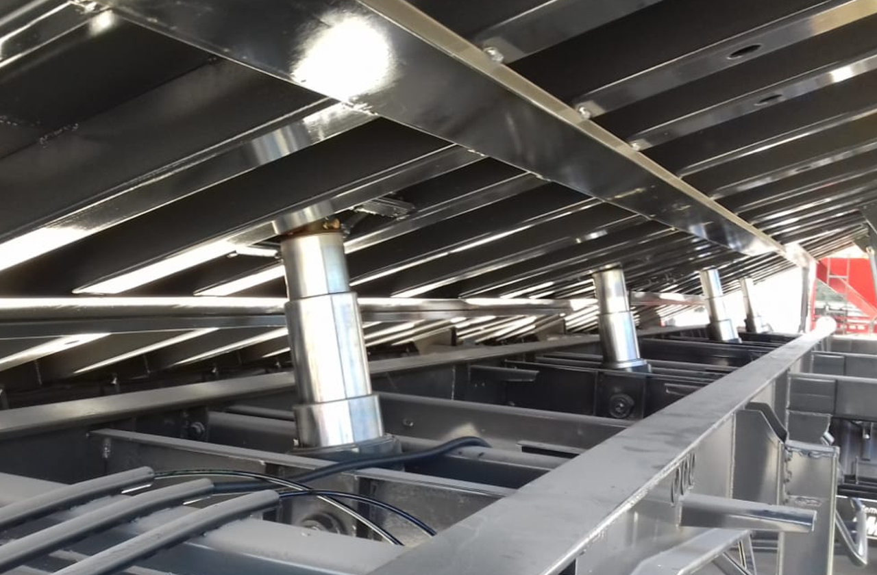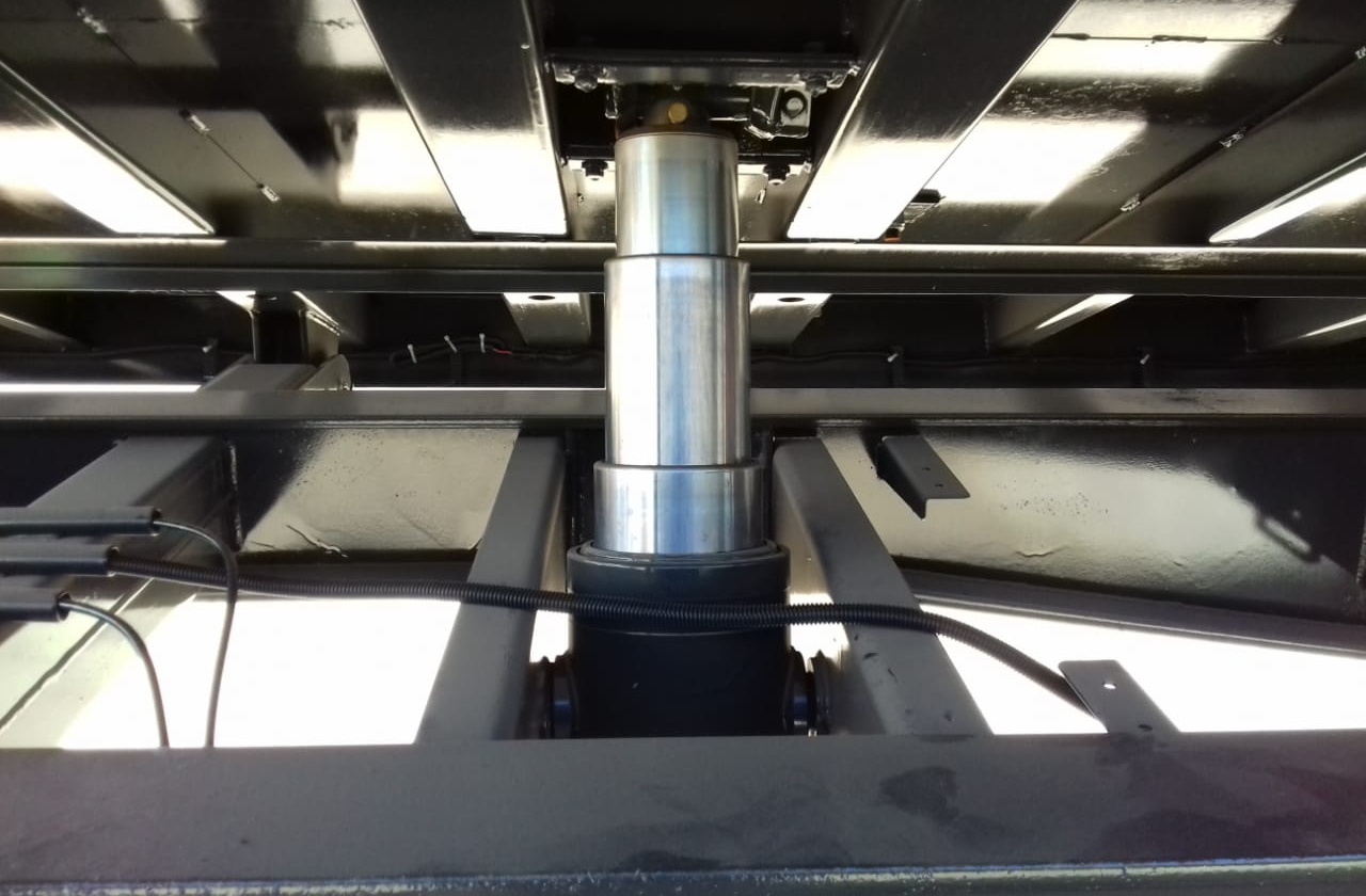 Apto para vuelco bilatereal de operación individual. Accionamiento hidráulico compuesto por cinco cilindros telescópicos reforzados de 4 etapas, 7" de diámetro y 800mm de recorrido. Válvula de fin de carrera y sobre-presión.